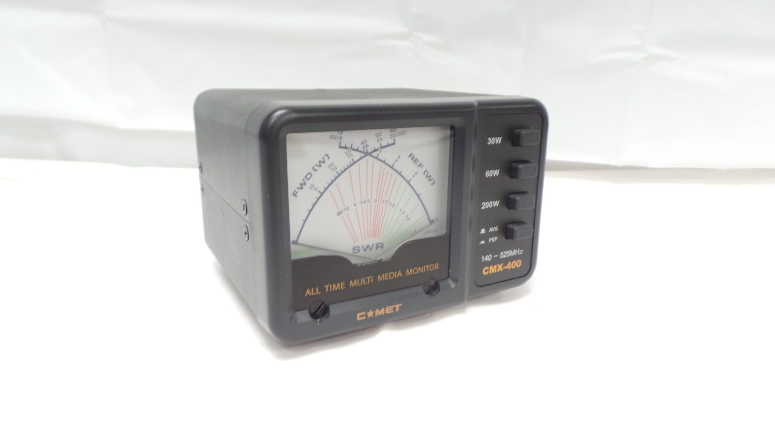 New CMX-400 meter, up to 200 watts power handling on VHF/UHF 140~525Mhz. Large, clear cross needle display reads FWD/REF and SWR simultaneously, and to minimize power loss CMX-400 has a built-in low loss sensor. The meter is very well illuminated in red and green.