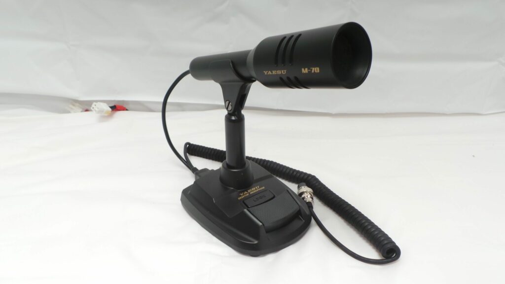 Yaesu introduced the M-70 Desktop Microphone, which was explicitly designed for its range of HF transceivers. This microphone features a directional condenser element that is finely tuned to enhance frequency response, ensuring clear and crisp audio during radio communications. The push-to-talk (PTT) mechanism employs three Air-Cylinder tubes, similar to those found in the Reference Microphone M-1, providing a reliable and smooth operation. Additionally, a conveniently located one-touch PTT keylock button allows for extended conversations without needing to hold the button continuously.