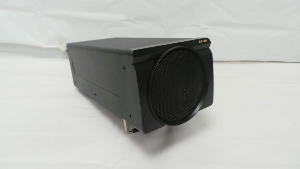 The Yaesu SP-30 is designed to be optically and electrically compatible with the FT-DX10 transceiver. It is positioned in a way that enhances intelligibility by radiating sound to the front. The speaker can be adjusted to the same inclination as the transceiver by extending the front feet. The speaker comes with a Cinch-socket connector and an approximately 80cm long connection cable. Its technical specifications include an impedance of 4 Ohm, a frequency response of 200 – 18000 Hz, and a maximum power of 12 watts. The dimensions of the speaker are 115 x 91 x 263 mm, with a weight of approximately 1.5 kg. It is specifically designed to be suitable for use with the FT-DX10 transceiver.